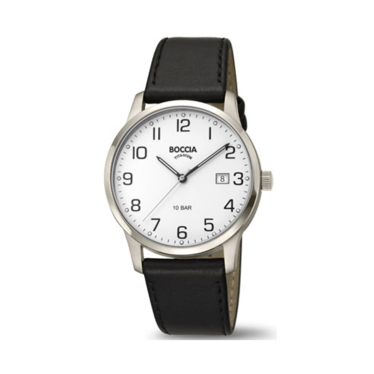 Prix unitaire par8/3621-02 - Boccia - Titanium - Montre Homme - Verre Minéral - Analogique - Bracelet Cuir Noir - Cadran Blanc - Titane - Mouvement Quartz - Etanchéité : 10ATM - Diamètre : 39mm - Dateur