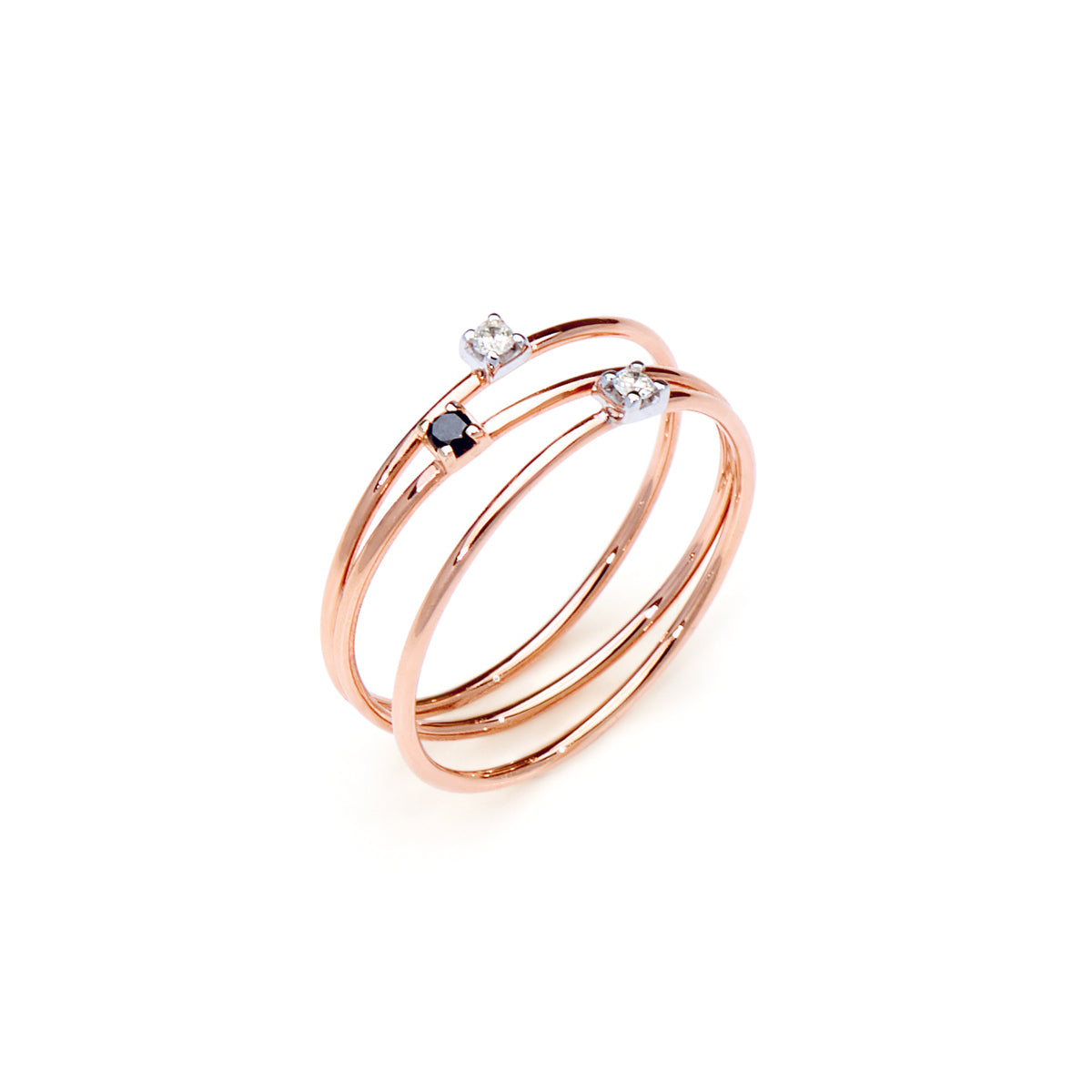 Trilpe anneau en or rose 18 carats, avec deux diamants blancs pour un total de 0.05ct et un diamant noir de 0.03ct.