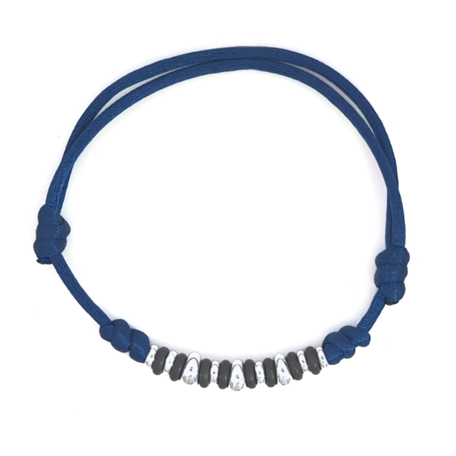 Bracelet avec trois Rondelles Bold en argent 925, quatre Rondelles en argent 925 et huit Rondelles en titane, cordon bleu marine 2mm.