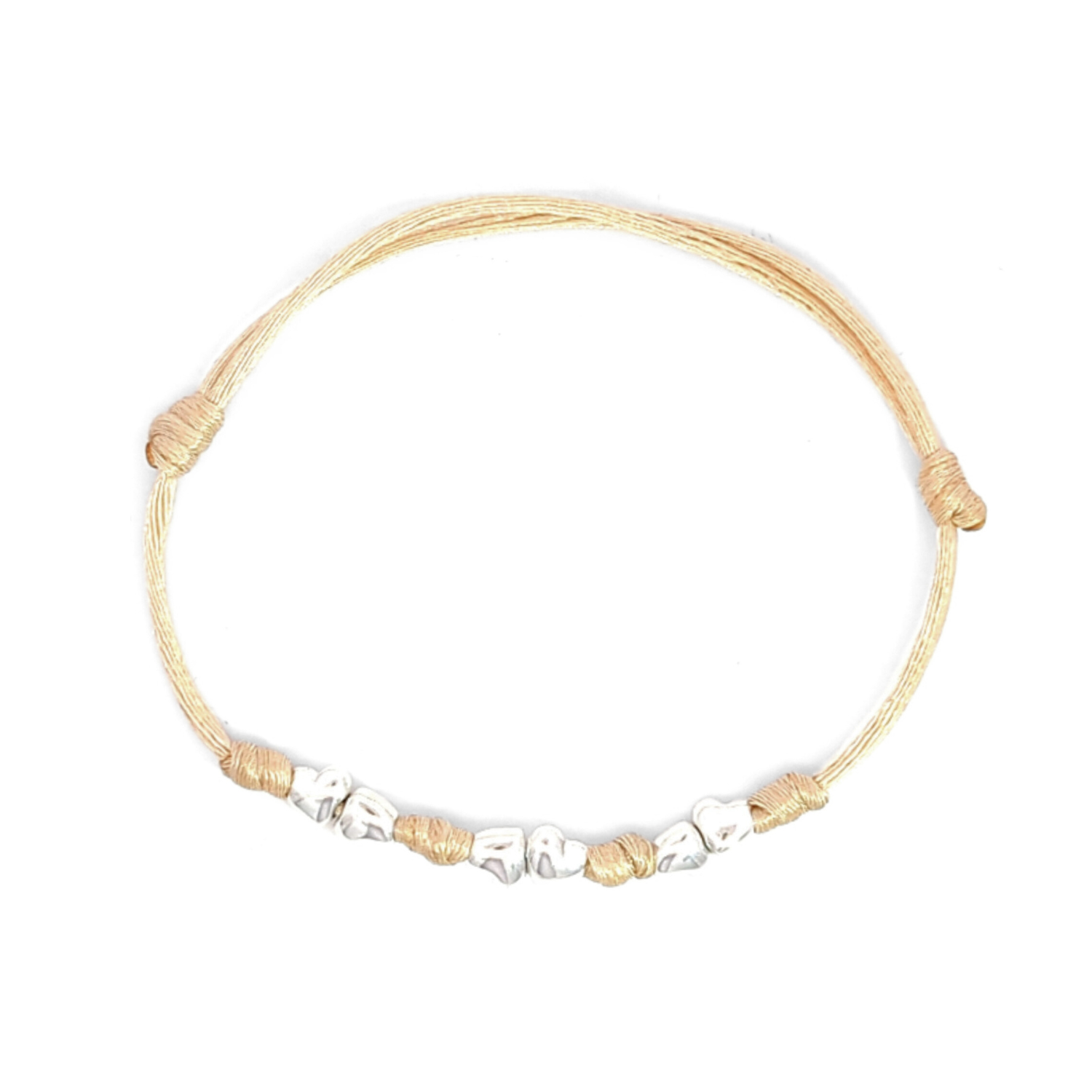 Bracelet avec six coeurs en argent, cordon champagne 1mm.