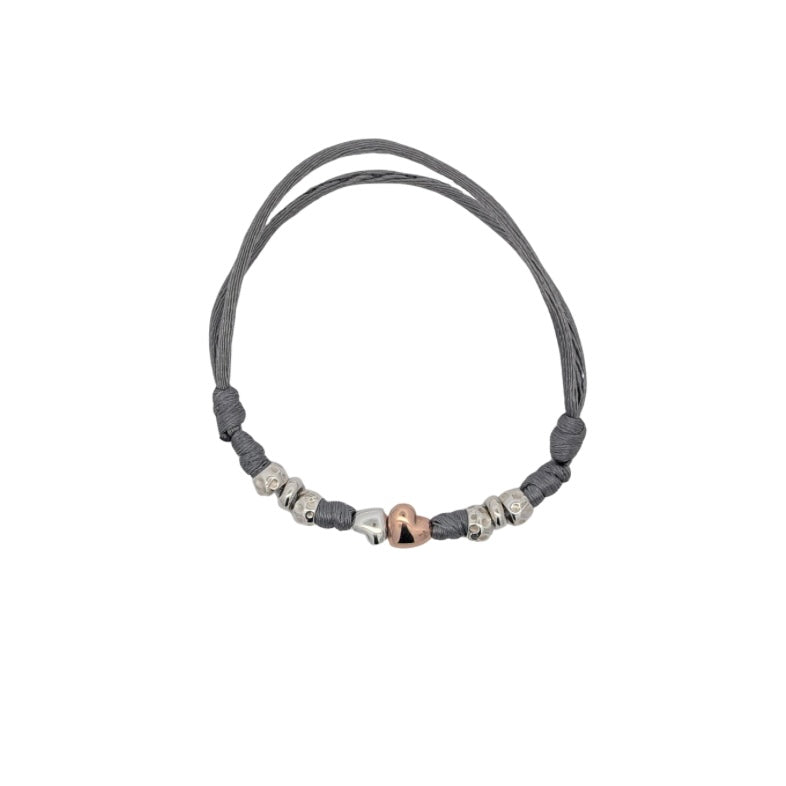 Bracelet avec 1 cœur en argent, 1 coeur en or rose 9ct, 4 Granellis & 2 rondelles. Cordon gris 1mm.
