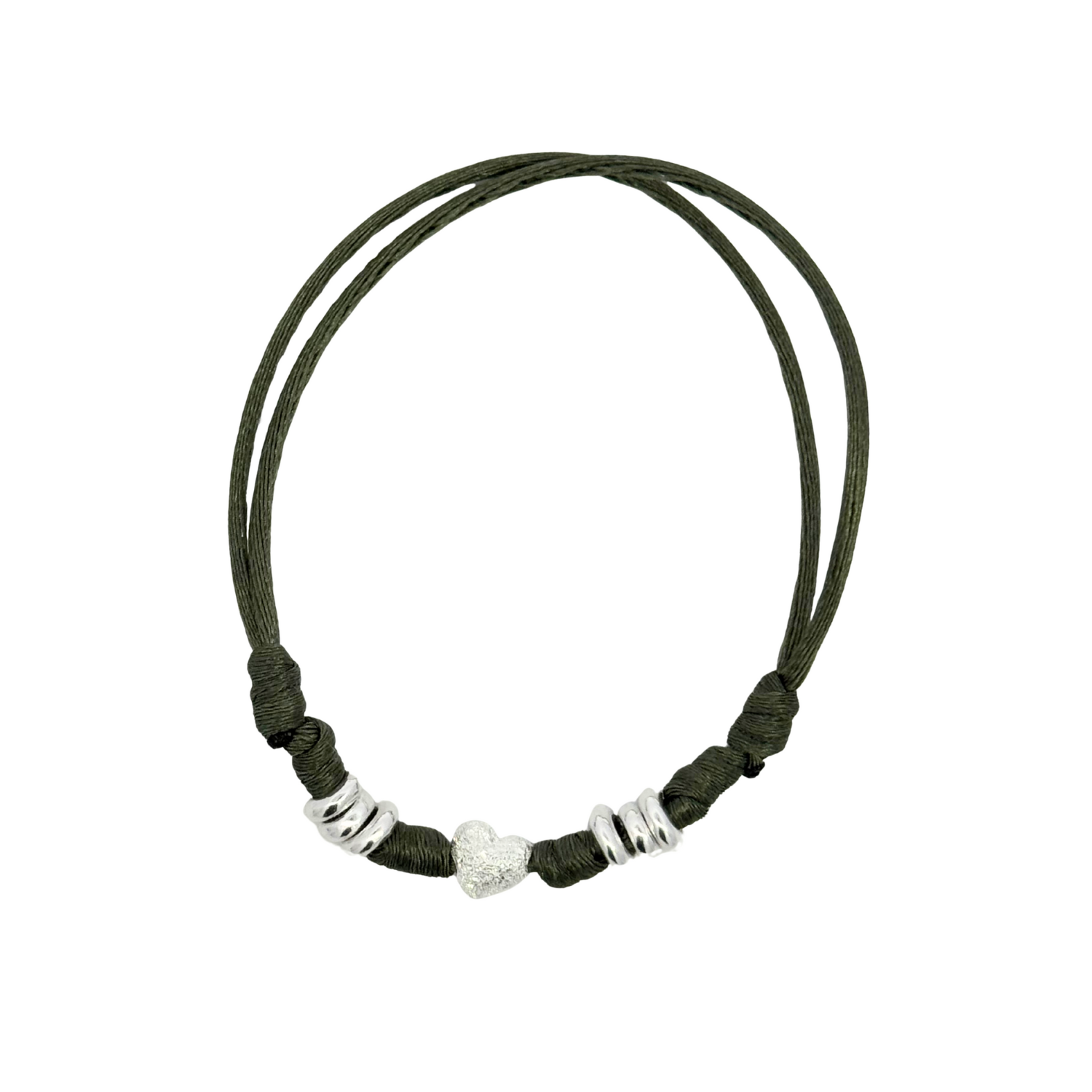 Bracelet avec 1 cœur en argent diamanté, 2 cœurs en argent & 6 rondelles en argent. Cordon 1mm.
