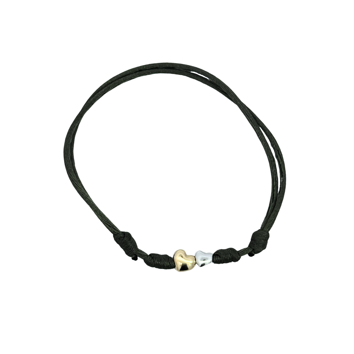 Bracelet avec 1 cœur en or jaune 9ct & un cœur en argent. Cordon 1mm.