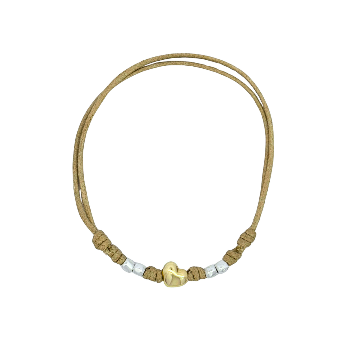 Bracelet avec 1 cœur en or jaune 9ct & 4 mini Granellis en argent. Cordon 1mm.