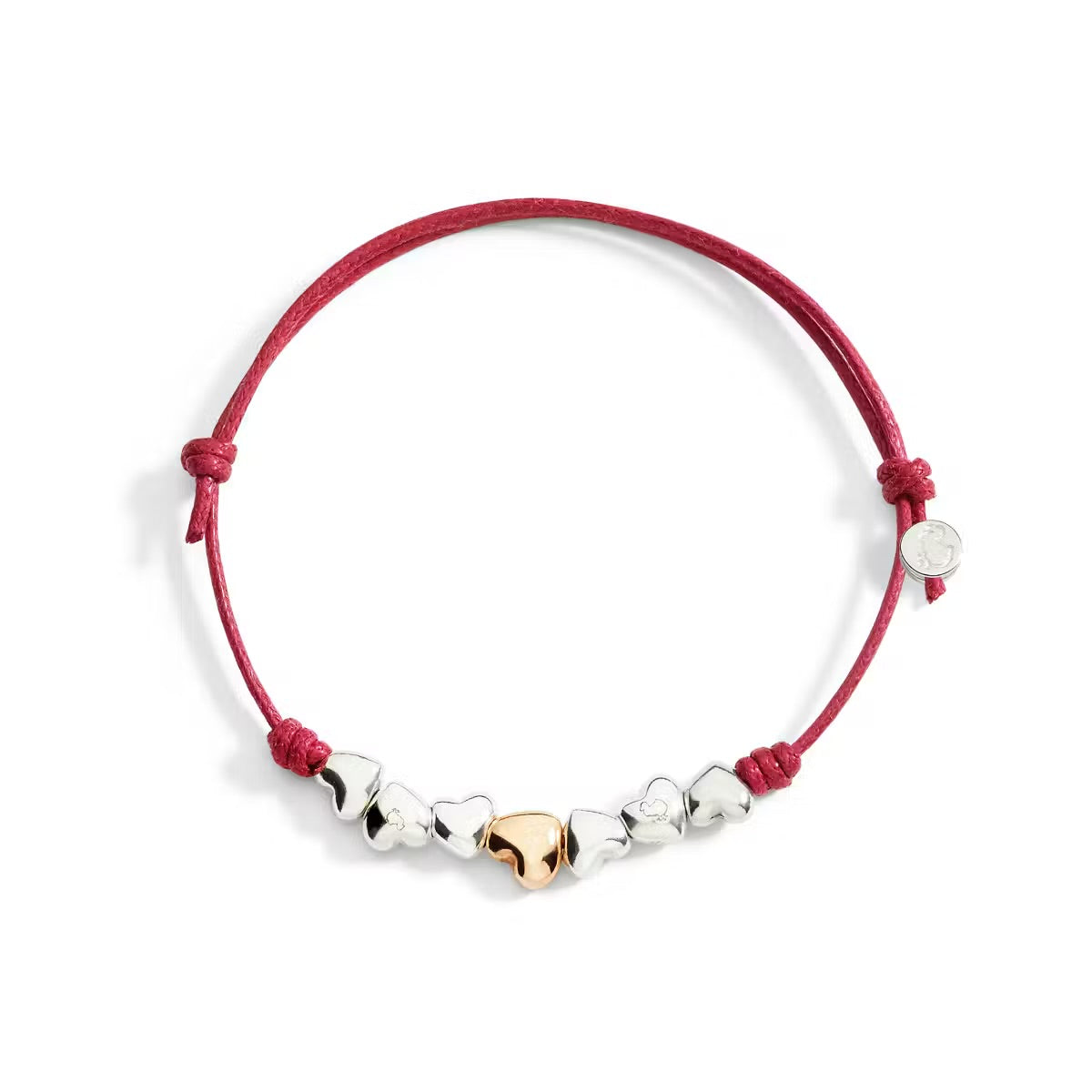 Bracelet avec 1 cœur en or rose ou jaune 9ct (au choix) & 6 cœurs lisses en argent. Cordon 1mm & tag.