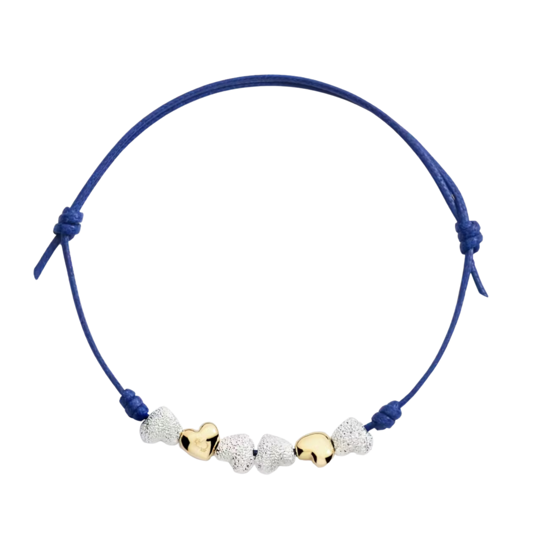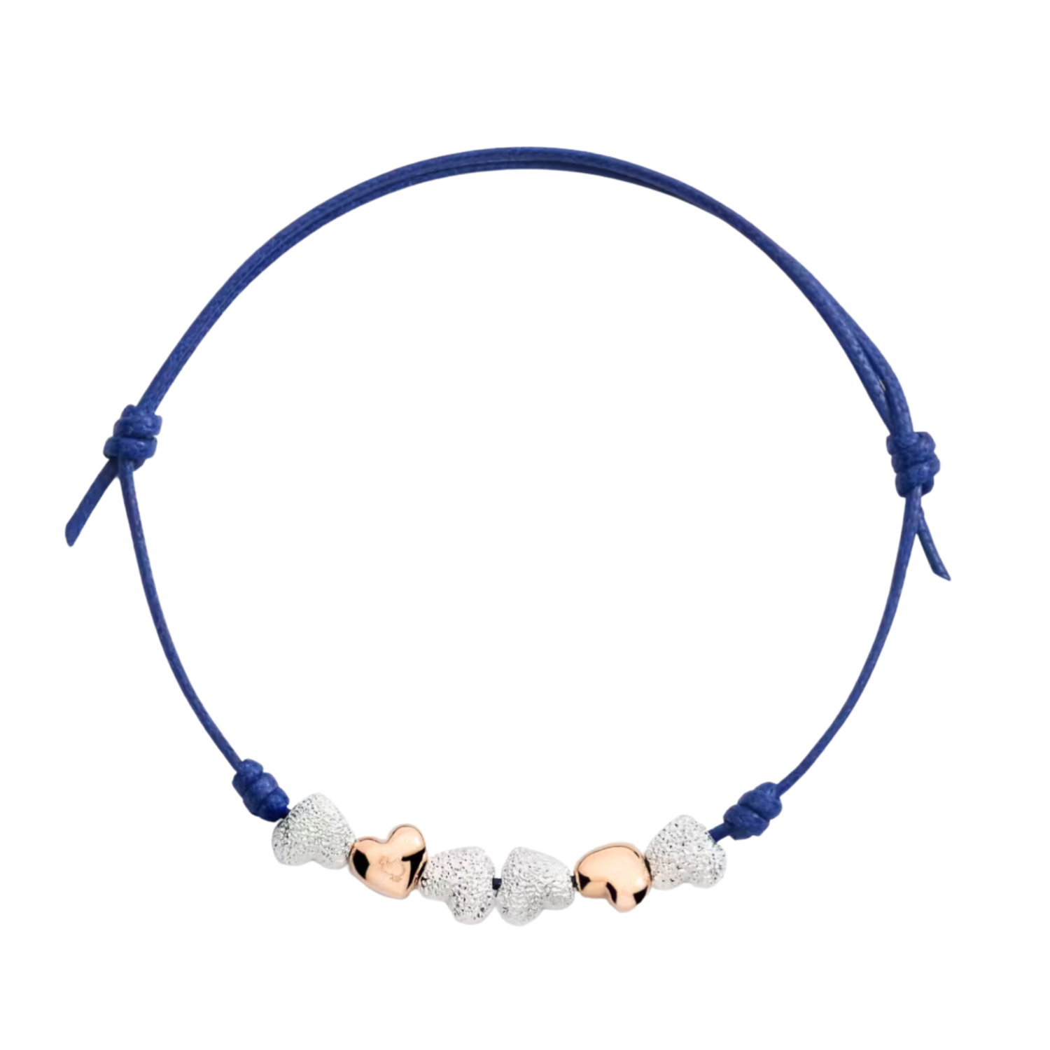 Bracelet avec 2 cœurs en or jaune ou rose 9ct (au choix) & 4 cœurs en argent diamantés. Cordon 1mm.
