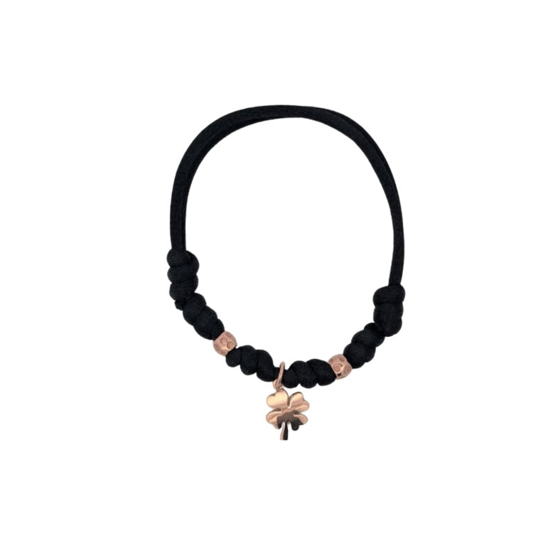Bracelet avec 1 trèfle en or rose 9ct, 2 Granellis en or rose 9ct, cordon noir de 2mm