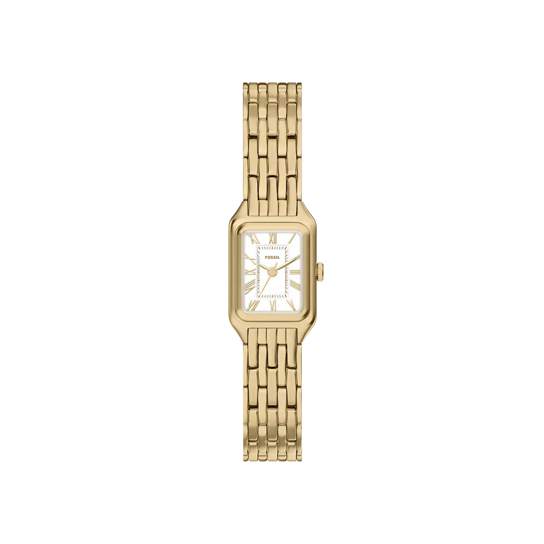 Cette montre présente un boîtier et un bracelet en acier inoxydable doré pour un look polyvalent et raffiné. Le petit boîtier rectangulaire doré accueille un cadran satiné blanc pourvu d’un mouvement à trois aiguilles sobre et épuré. Doté d'une boucle déployante à double pression, le bracelet garantit un maintien sûr et confortable.