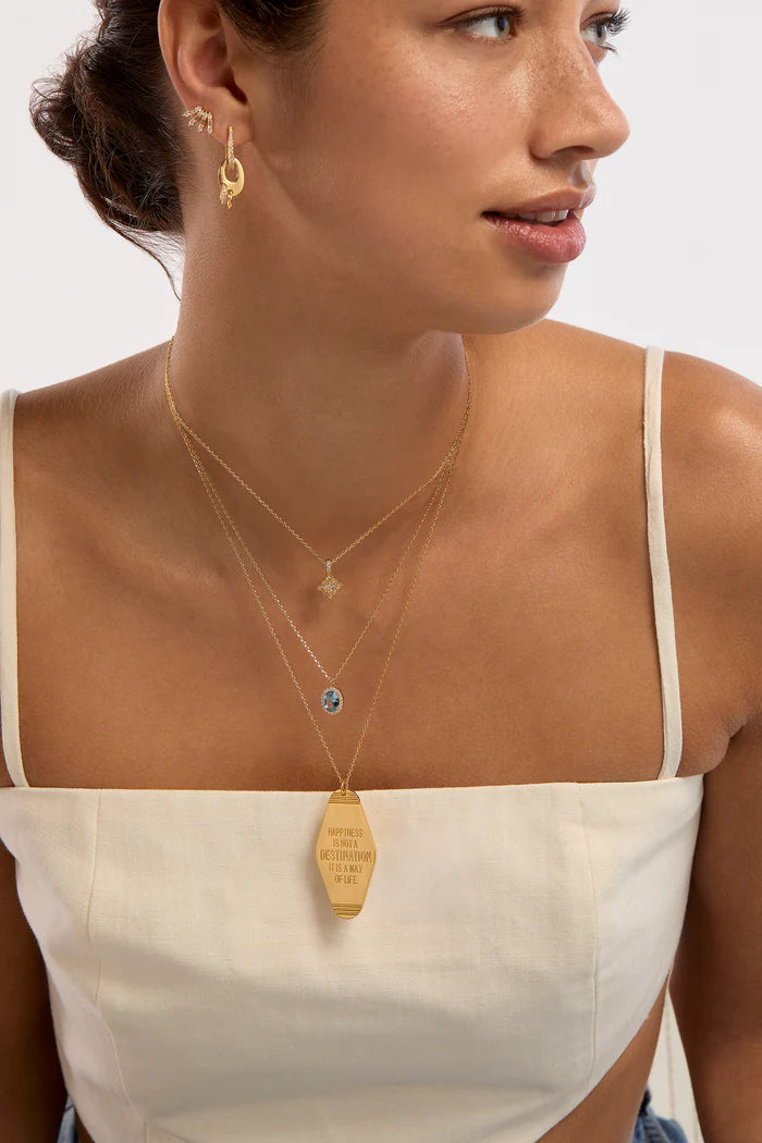 Le collier BLUE DYNASTY de MYA—BAY séduit par son zircon bleu clair, doux et lumineux. Inspiré des bijoux vintage, ce bijou faussement classique capte la lumière avec délicatesse et apporte une touche fraîche et élégante au décolleté. Monté sur une chaîne fine, il se porte facilement au quotidien comme en soirée.