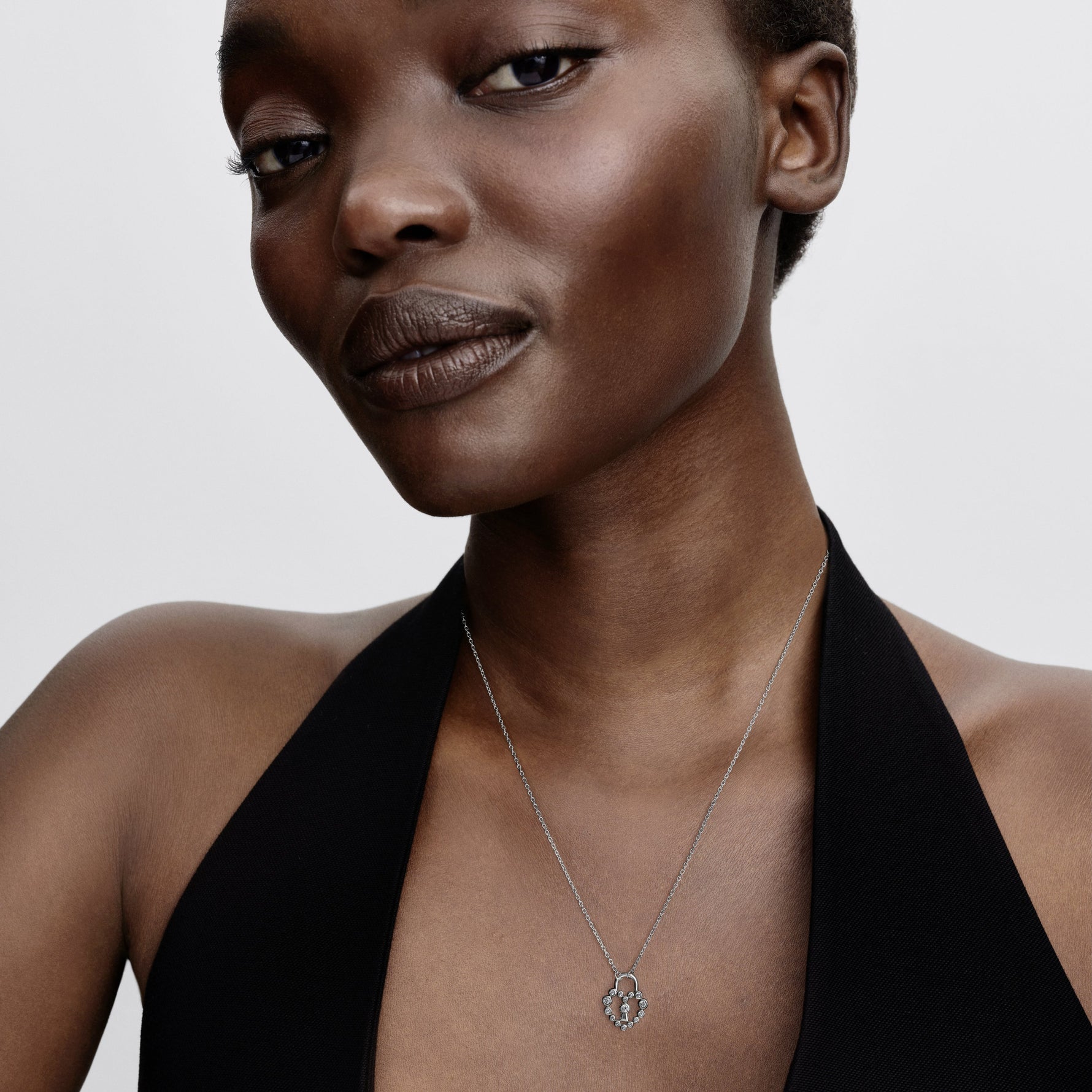 Cadenassez votre look avec une bonne dose d'amour avec notre collier à pendentif cadenas en forme de cœur en argent 925/1000e. Ce bijou est orné d'oxydes de zirconium cubiques de tailles différentes sertis en forme de cœur et se distingue par son cadenas central symbolisant l'amour et l'unité.